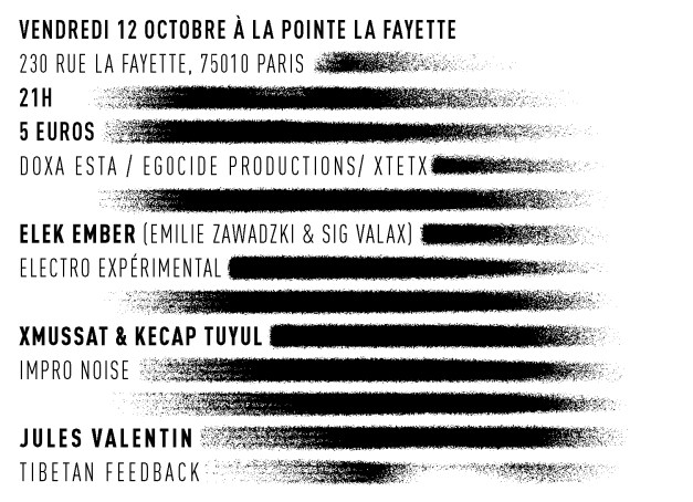 - Dimanche 14 octobre : z(xW+yV) (nouveau projet solo), aux Nautes (Paris), avec aussi Muyassar Kurdi , Lazy Terms, Juhász Tamás, NPNP, Ohaguro. L’évenement sur facebook (organisé par CmptrMtmtcs)