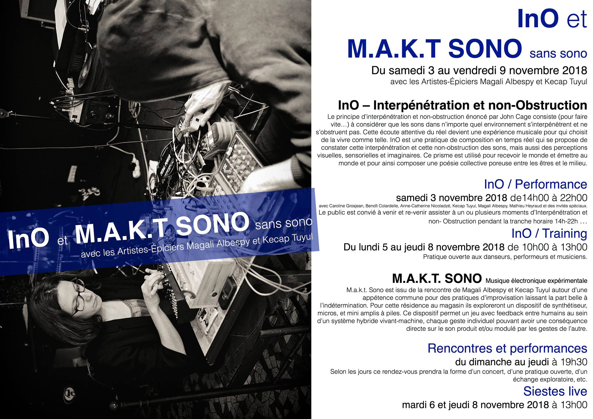 - 4, 5, 6, 7 et 8 novembre 2018 : Concerts M.A.K.T. Sono, dans le cadre de la résidence “InO et M.A.K.T. Sono sans sono” avec Magali Albespy (3-9 novembre), Le Magasin-Mathieu Heyraud, Saint-Etienne.